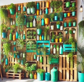 Paletes de madeira: Servem como estrutura para encaixar vasos.